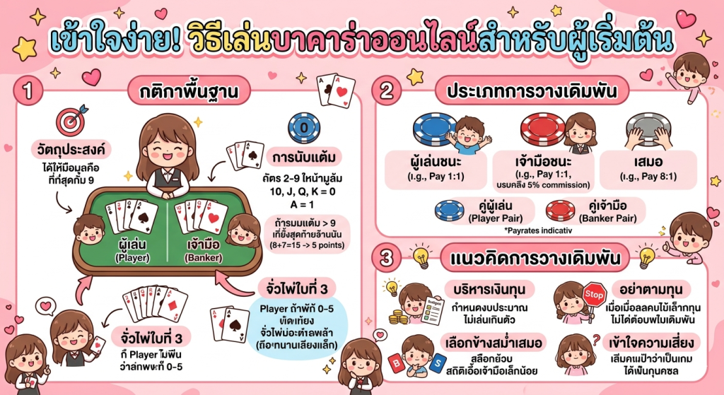 บทความนี้จะอธิบายตั้งแต่พื้นฐานของบาคาร่า วิธีการเล่นจริงในแต่ละรอบ กฎการแจกไพ่ เทคนิคการวางเดิมพัน ไปจนถึงแนวคิดในการบริหารเงินทุน เพื่อช่วยให้ผู้เล่นสามารถเริ่มต้นได้อย่างถูกต้องและมีประสิทธิภาพ